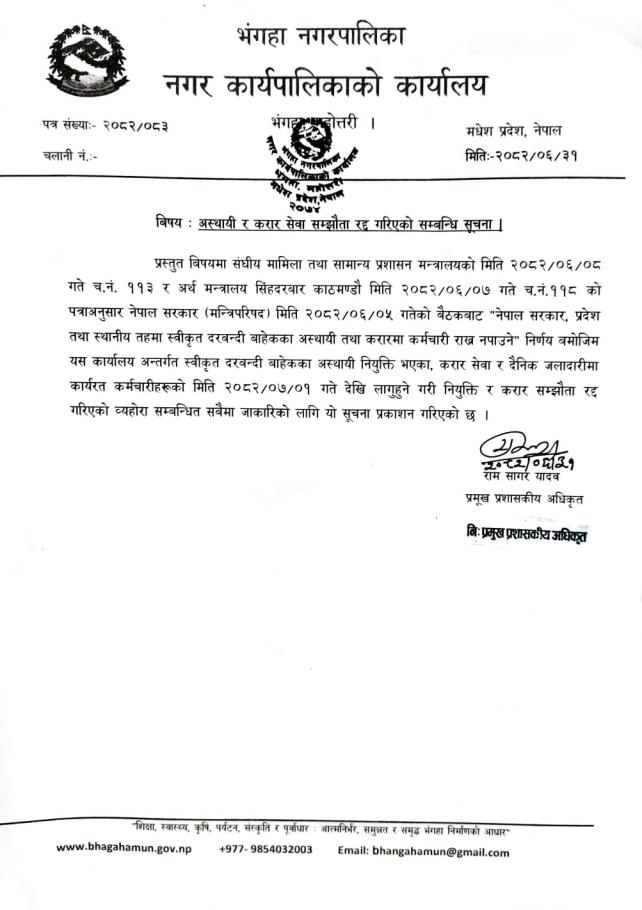 » अस्थायी र करार सेवा सम्झौता रद्द गरिएको सम्बन्धि सूचना ।