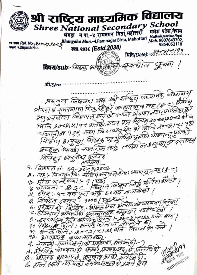 शिक्षक आवश्यकता सम्बन्धी सूचना ।